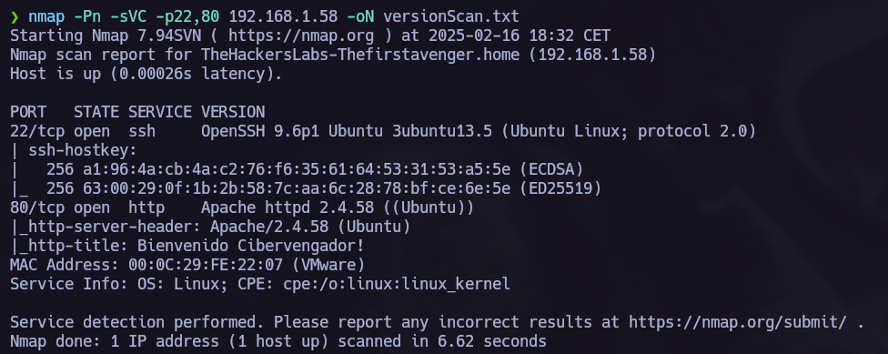nmap -p<PORTS> -sVC -Pn <IP> -oN versionScan.txt